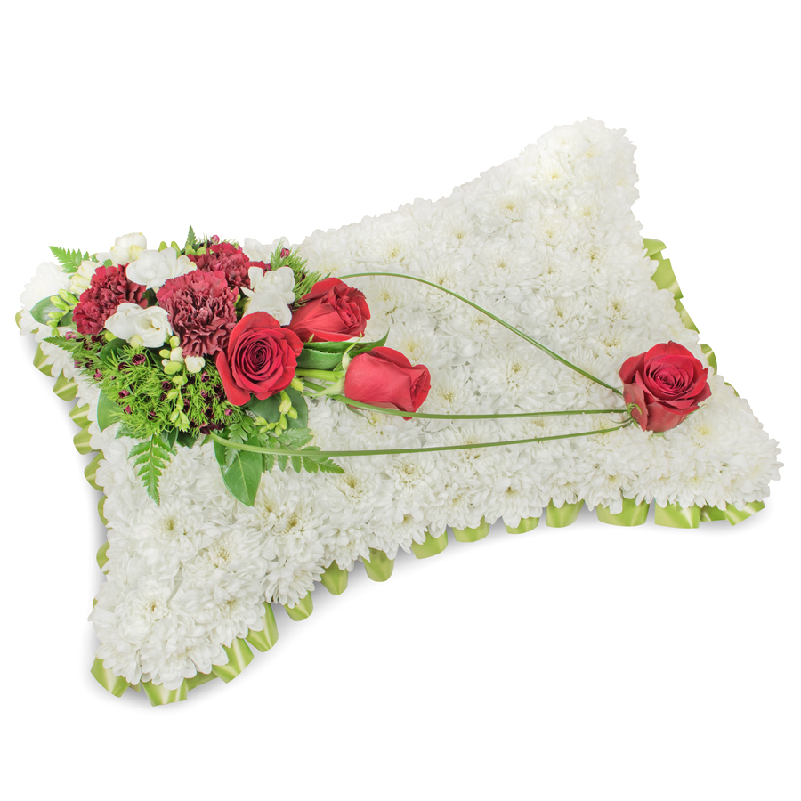 Express your heartfelt condolences with our stunning bouquet, meticulously crafted to convey sympathy and care. This unique arrangement features a harmonious blend of white chrysanthemums, red roses, white freesias, dark red carnations, dianthus, and bear grass, creating a visually appealing and meaningful display.